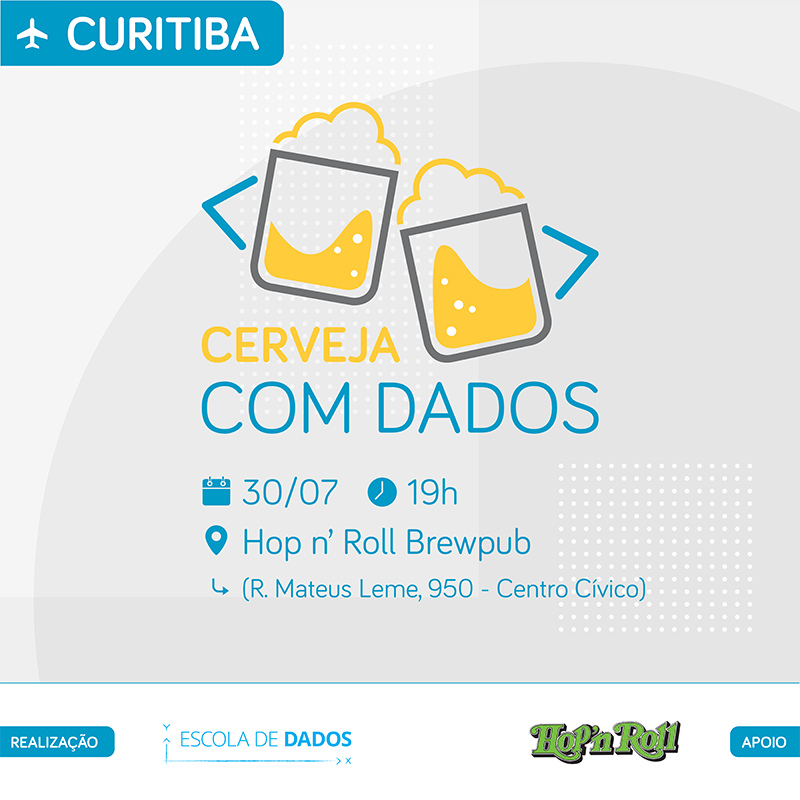 No dia 30/07, mais uma edição do Cerveja com Dados rola em Curitiba. O encontro será, mais uma vez, no Hop n’ Roll Brewpub (R. Mateus Leme, 950 – Centro Cívico). Para participar, basta confirmar presença no nosso evento no MeetUp. No line-up, teremos três apresentações de 30 minutos: