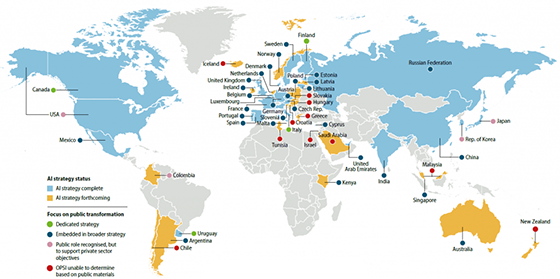 O mapa acima é do Observatory of Public Sector Innovation e traz um resumo dos países com estratégias nacionais de inteligência artificial.