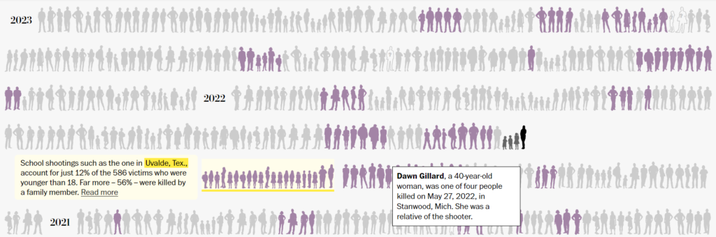 Utilizando dados do Associated Press, USA Today e Northeastern University, o jornal The Washington Post desenvolveu uma visualização que mostra, desde 2006, os números de pessoas mortas por armas de fogo. Descrevendo como “assassinatos em massa com armas”, as análises apontaram que a maioria dos casos, 24 vezes em média desde 2006, acontecem com pessoas conhecidas do atirador, revelando que estes eventos não são explosões aleatórias de violência pública. O objetivo do projeto é apontar as pessoas assassinadas, os atiradores e as circunstâncias em torno do assassinato.