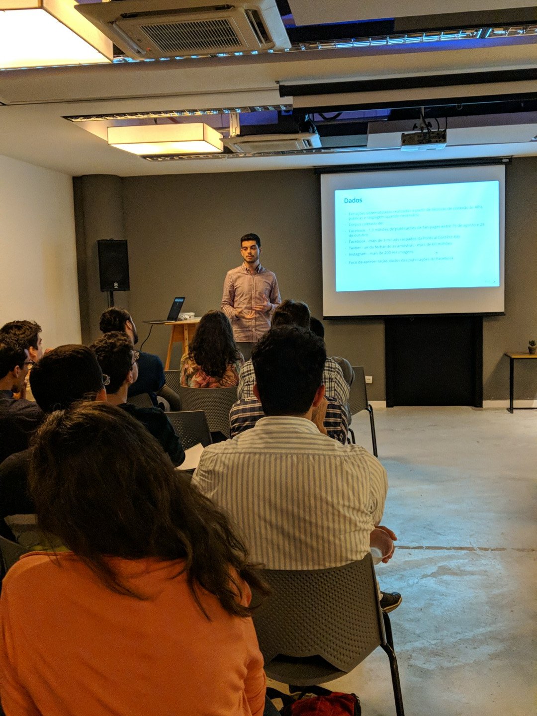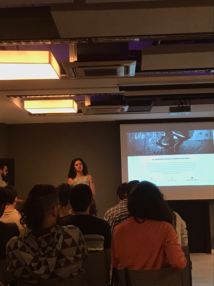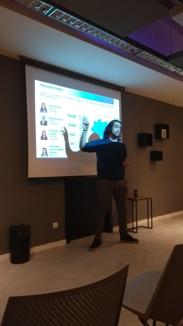 Marcelo Alves apresentou sua pesquisa que usou R e centenas de milhares de postagens em redes sociais para entender as dinâmicas eleitorais em 2018 na Internet. Tanto a apresentação, como a rede de visualização das postagens estão disponíveis no repositório RPubs do autor. Já Clara Sacco falou do Cocozap, projeto do Datalabe para coletar dados sobre meio ambiente e saneamento básico no Complexo da Maré, no Rio de Janeiro.