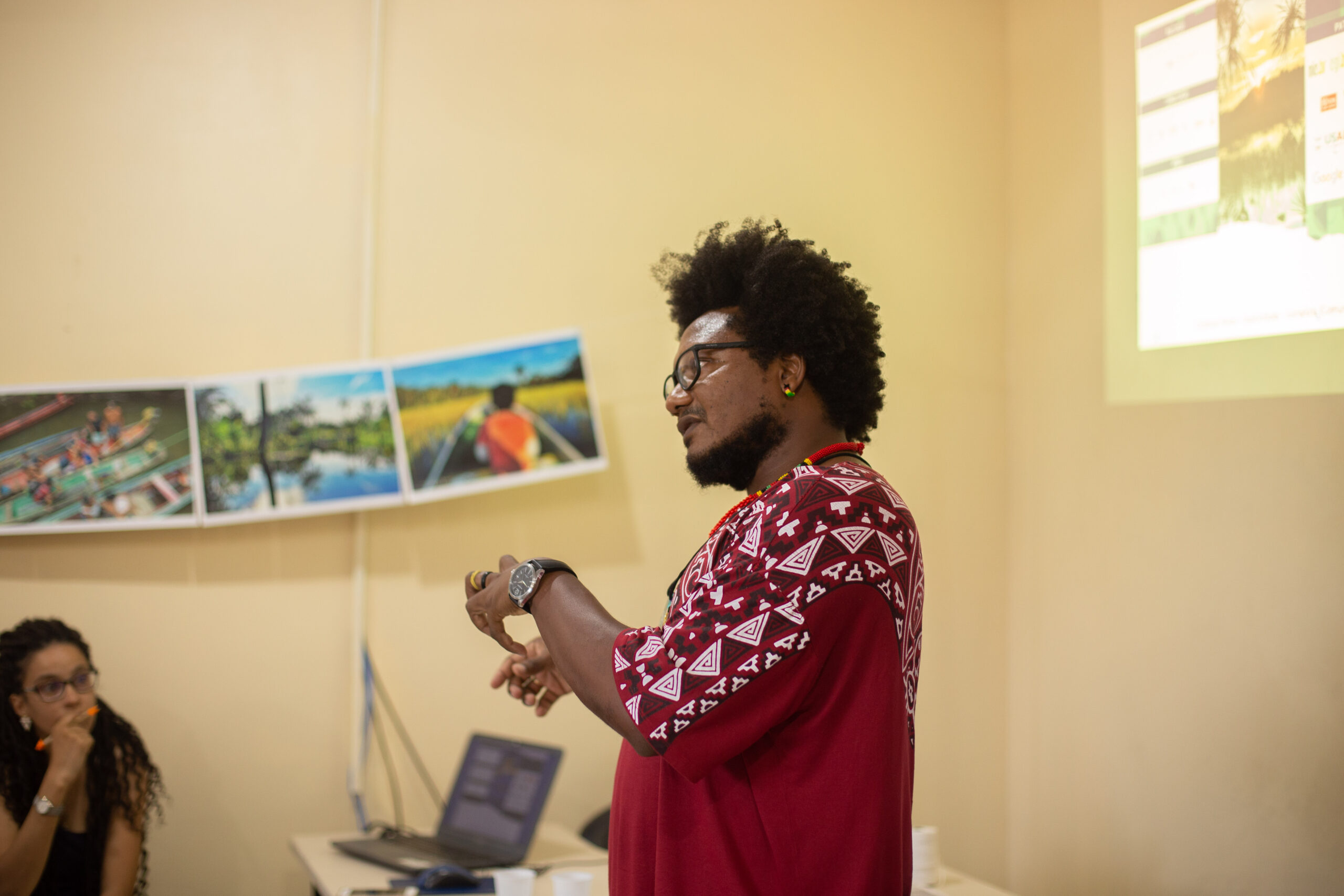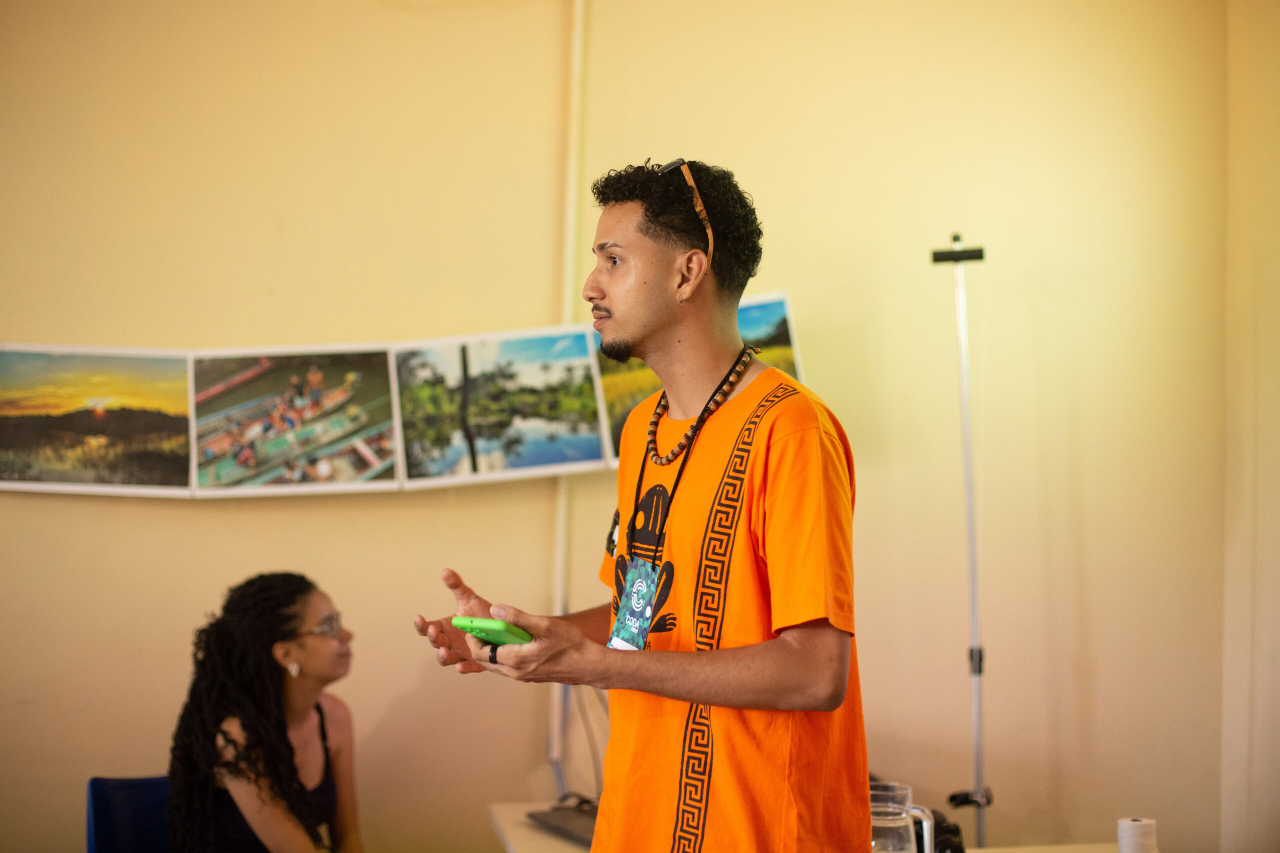 A seguir, Matheus Adams trouxe um pouco de sua origem. O jovem é da comunidade tradicional Vila do Pesqueiro, de Soure. Segundo ele, o maretório do Marajó contém a primeira reserva extrativista do país: a reserva marinha de Soure. É por meio do extrativismo que a população garante sua renda.