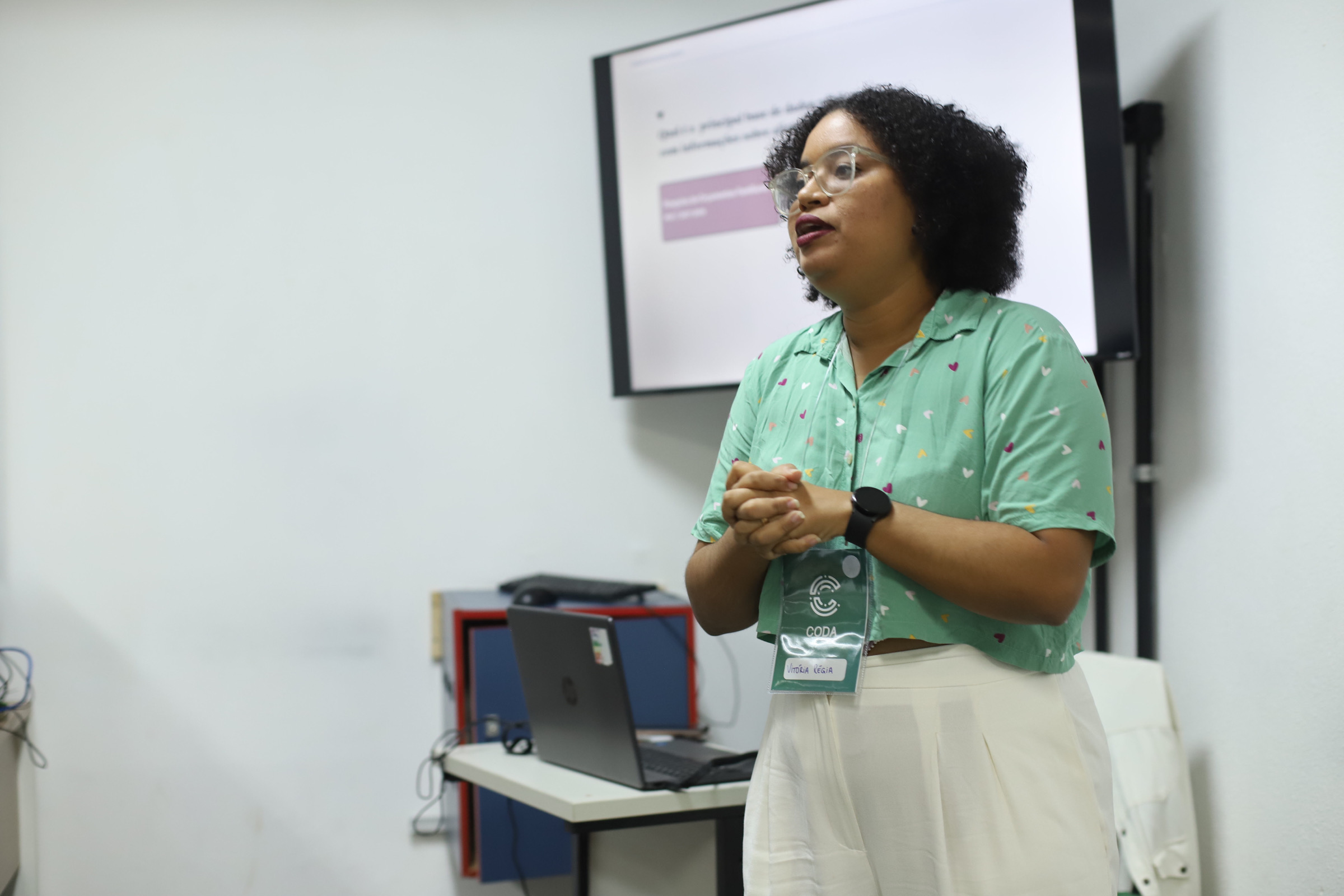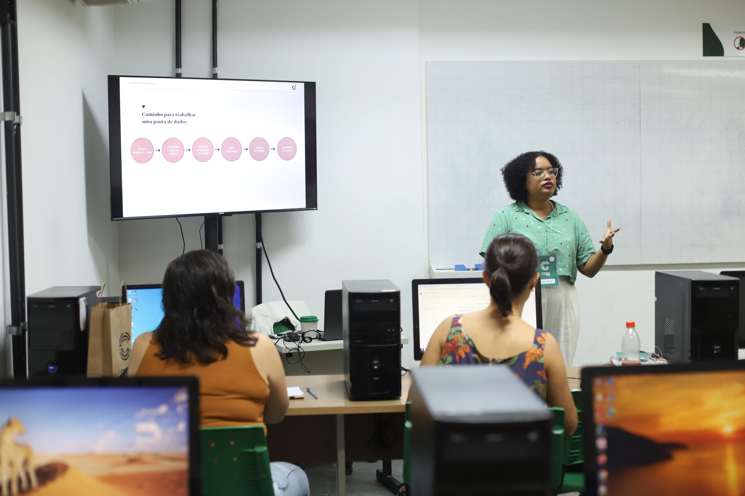 Vitória Régia, diretora de conteúdo na Gênero e Número, abriu a oficina explicando um pouco sobre a organização em que atua. A Gênero e Número é uma organização sem fins lucrativos que produz, analisa e dissemina dados especializados em raça, gênero e sexualidade com o propósito de impulsionar o debate sobre equidade e embasar o discurso de mudança. A partir de linguagem gráfica, conteúdo audiovisual, pesquisas, relatórios e reportagens multimídia, ela pretende alcançar e informar a audiência interessada nessa perspectiva.