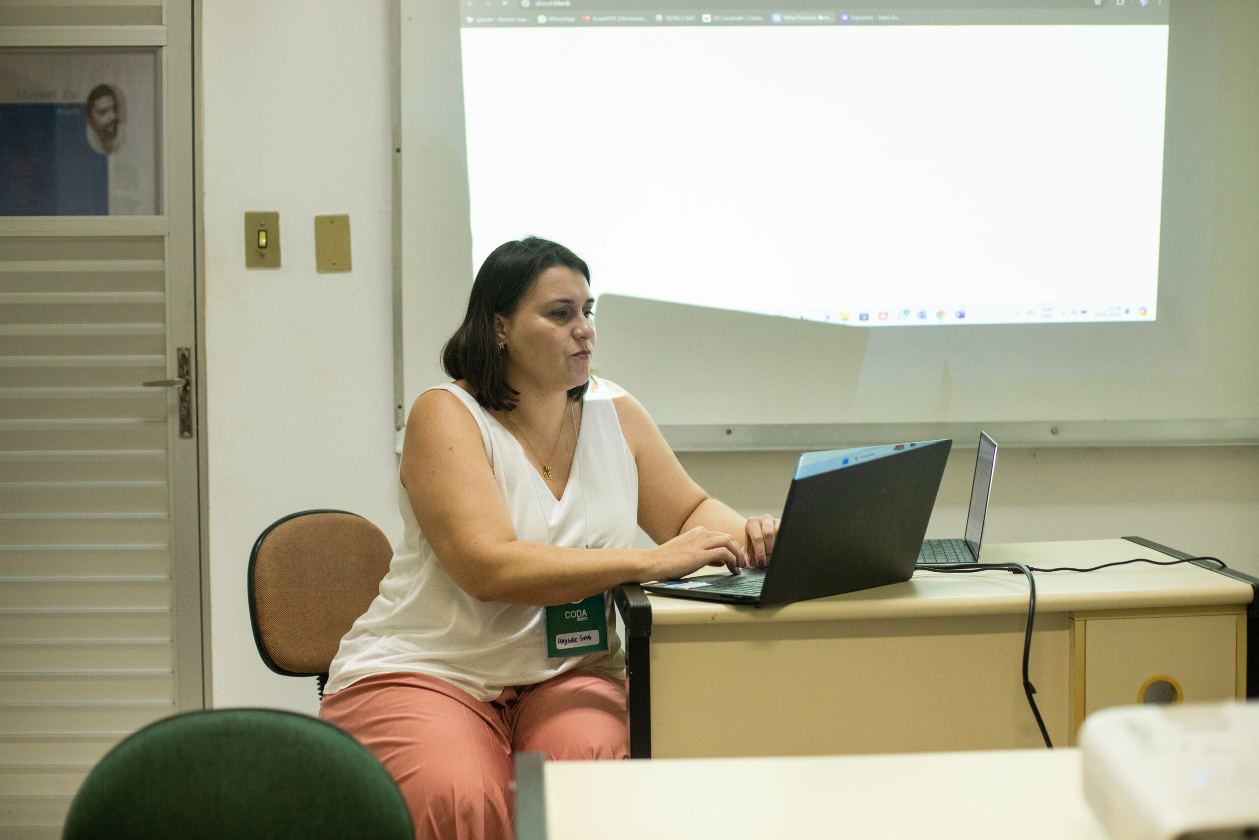 A diretora executiva da Open Knowledge Brasil, Haydée Svab, conduziu a roda de conversa apresentando as pessoas representantes das instituições que participaram desse debate sobre combate às mudanças climáticas.