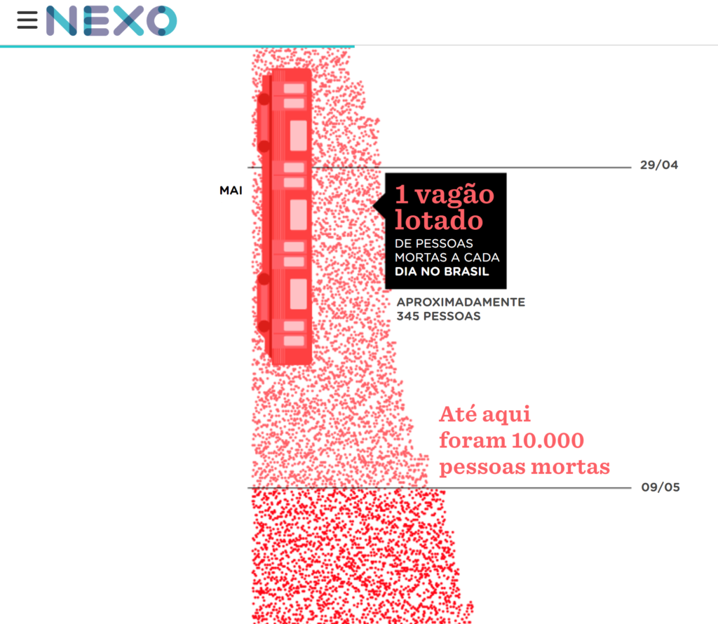 Por fim, Lucas Gomes, infografista do Nexo, contou que o projeto “O cálculo de uma tragédia” era parte de uma série do veículo exibindo as faces da crise do coronavírus. A ideia era mostrar a dimensão das mortes pela doença no Brasil, ressaltando os grupos mais afetados de uma forma impactante. Ele comentou que, pensando justamente nessa acessibilidade, o jornal deu enfoque na visualização para celulares – a principal fonte de acessos do Nexo. A partir de um plano inicial que consistia em representar cada pessoa morta por um ponto, a equipe chegou aos cálculos e percebeu que, no platô da epidemia no país, o Brasil estava perdendo um trem lotado de pessoas a cada dois dias. “O trem lotado é uma figura de linguagem muito poderosa”, contou.