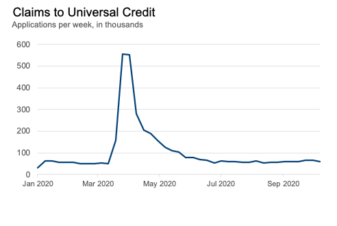 Nos gráficos, dê contexto suficiente para as pessoas entenderem porque os dados que você está mostrando a elas são importantes. Para isso, Catherine recomenda usar o recursos de incluir anotações em texto sobre o gráfico, dando como exemplo uma visualização de dados feita por ela para retratar a evolução das solicitações do “crédito universal” por semana. O “Universal Credit” é uma política de segurança social do governo para famílias de baixa renda.