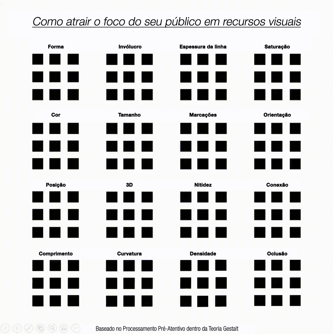 A animação abaixo foi produzida por Alvin Wendt e traduzida para o português pela Escola de Dados. Ela traz uma lista dos “atributos pré-atentivos” listados no capítulo 1 do recém-lançado livro ‘Better Data Visualizations – A Guide for Scholars, Researchers, and Wonks’, escrito por Jonathan A. Schwabish.