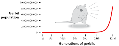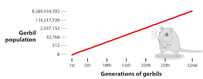 Os quatro gerbilos acasalam e cada casal dá a luz a quatro pequeninos (oito gerbilinhos no total). Agora, seguindo nosso raciocínio, vamos imaginar que os pais morram logo depois do nascimento. Os gerbilos continuam reproduzindo-se nessa taxa constante, de forma que cada geração dobra de quantidade em relação à anterior.