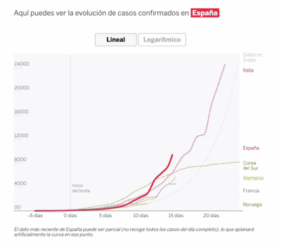 Outra solução é aproveitar a chance de interação. Mostrar dados em uma escala linear também tem seu valor. Ela não só é mais dramática do que uma escala não linear, mas também dá aos leitores uma visão adicional dos dados. Por que não deixar as pessoas alternarem entre uma escala linear e uma não linear? Isso é exatamente o que o “El País” da Espanha fez nessa visualização.