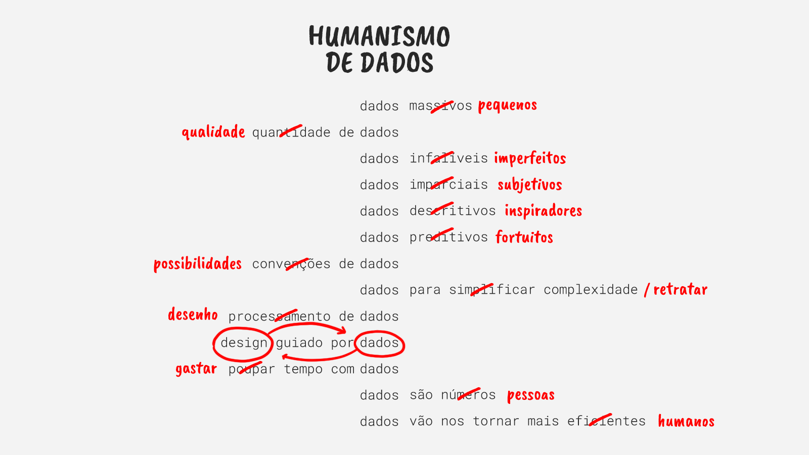 Devemos aprender como incluir e processar os aspectos mais qualitativos e diferenciados dos dados. Devemos experimentar como visualizar incertezas, possíveis erros e imperfeições em nossos dados. E o mais importante, devemos ter em mente como os dados podem ser uma ferramenta poderosa para todos os designers, trazendo histórias para a vida de uma forma visual e adicionando significados estruturais aos nossos projetos.