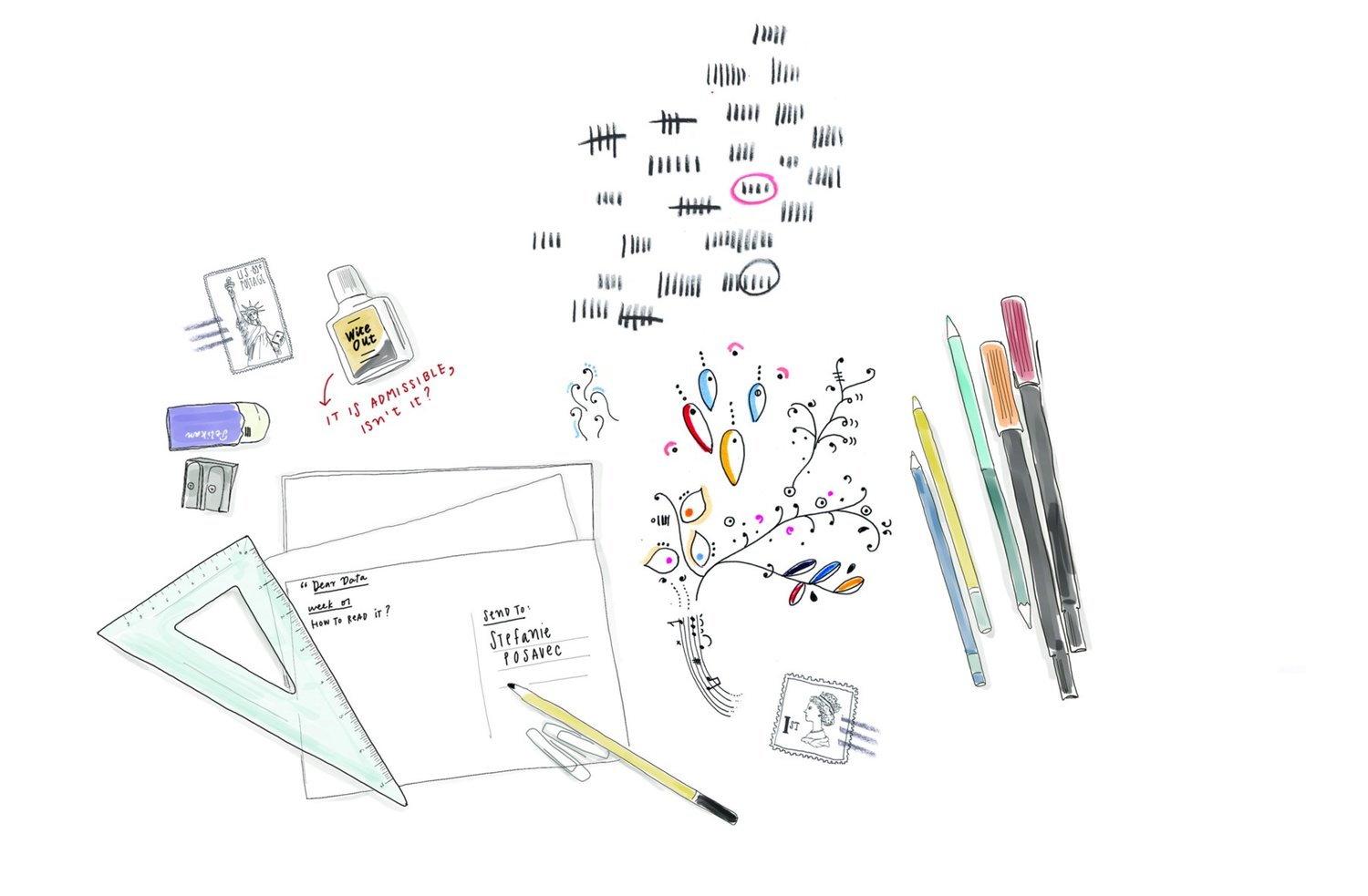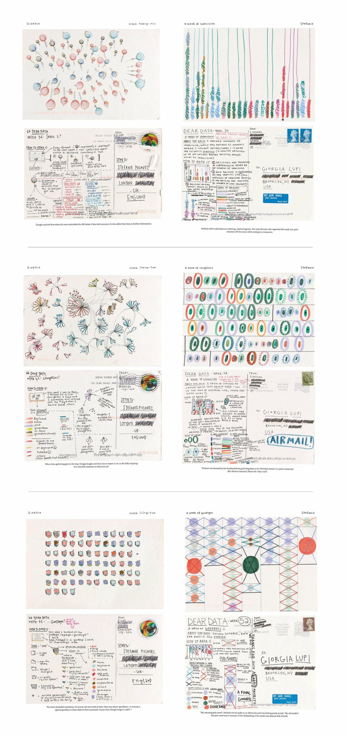 Para pesquisar esse campo, empreendi um laborioso projeto pessoal: um ano de correspondência de dados desenhada à mão com a designer de informações Stefanie Posavec. Temos inúmeras semelhanças pessoais e profissionais – sou italiana e moro em Nova York; ela é americana e mora em Londres. Temos exatamente a mesma idade e somos filhas únicas, morando longe de nossas famílias. O mais importante, nós duas trabalhamos com dados de uma forma artesanal, tentando adicionar um toque humano ao mundo da computação e dos algoritmos, usando o desenho em vez da codificação como nossa forma de expressão. E apesar de ter nos encontrado apenas duas vezes pessoalmente, embarcamos no que chamamos de “Dear Data”.