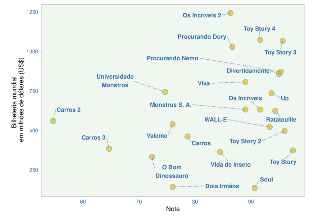Por outro lado, há coincidência na maioria dos outros filmes, especialmente no quadrante dos filmes com melhor classificação da crítica e desempenho de bilheteria. Para estes casos, Toy Story 3, Toy Story 4 e Procurando Nemo parecem ser os melhores exemplos.