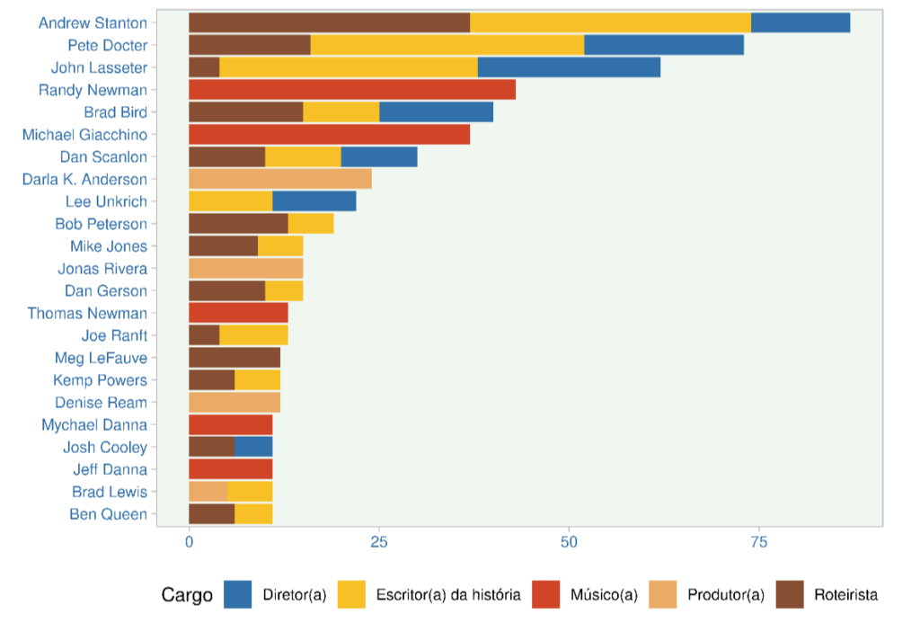 Como não poderia ser de outra forma, devemos deixar os créditos dos filmes. Aqui a opção é utilizar os recursos de visualização de dados. Mostrarei abaixo os 23 profissionais que mais apareceram nessas pequenas letras no final dos filmes.