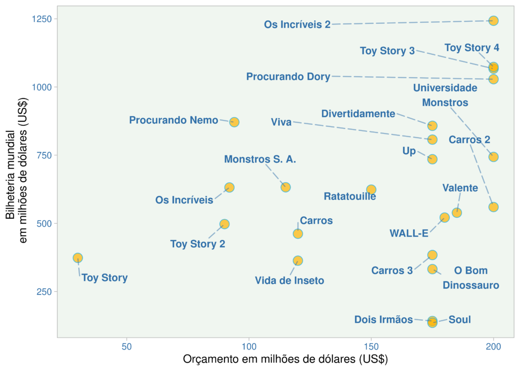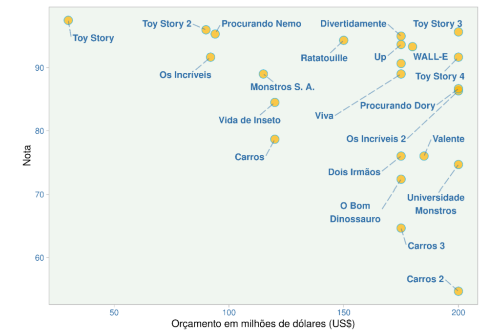Em nossa última análise, parece estar claro que as avaliações críticas nem sempre coincidem com as avaliações do público, aqui representado pelas bilheterias alcançadas pelos filmes. Vemos que há casos de sucesso de crítica como Soul e Toy Story 2, mas com baixa receita. Toy Story está neste quadrante, mas como indicamos anteriormente, é difícil avaliá-lo como um relativo fracasso do público com base na receita do filme, já que se trata de valores de mais de duas décadas.