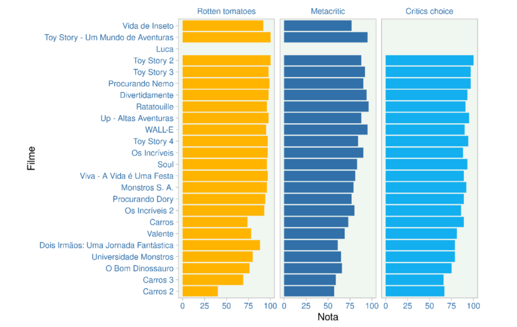Apesar de nossa primeira preferência ser Carros, isso não é uma unanimidade. Neste primeiro gráfico abaixo, mostramos o ranking dos filmes da Pixar em 3 fontes de dados diferentes (Rotten Tomatoes, Metacric e Critics Choice).