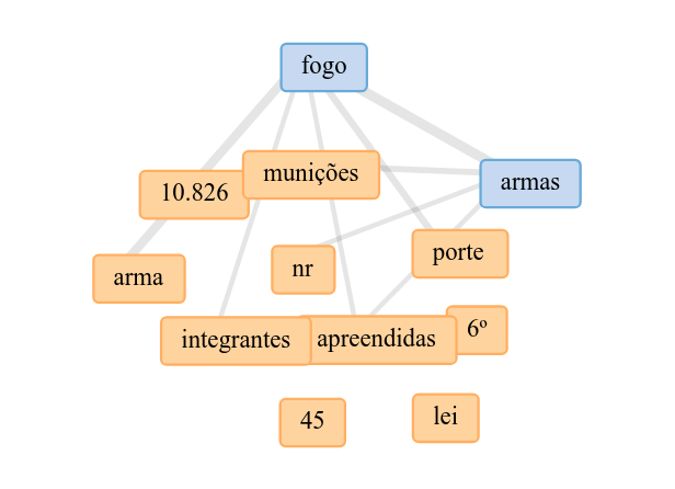 Além das famigeradas nuvens de palavras, o Voyant Tools também permite criar outros tipos de visualizações com poucos cliques. Na imagem acima, uma rede de palavras gerada na plataforma, com o texto do decreto n.10.630 de 12 de fevereiro de 2021, um dos mais recentes “decretos das armas” do presidente em exercício Jair Bolsonaro.