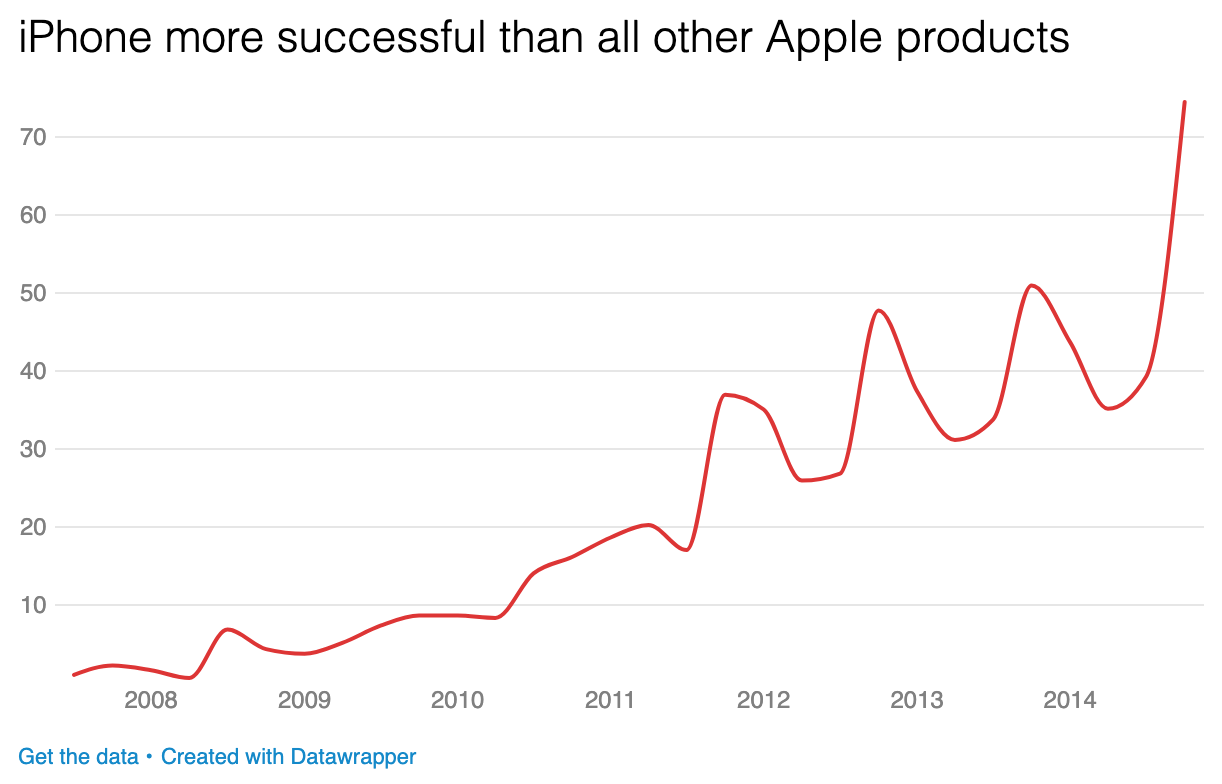 Depois de encontrar os dados necessários para seu gráfico, é hora de testar sua hipótese. Se ela estiver errada, então, é necessário voltar à etapa que começa o fluxo de trabalho e repensar toda história que será contada. No exemplo, porém, é verdadeira a hipótese de que o iPhone foi produto de maior sucesso da Apple na última década.