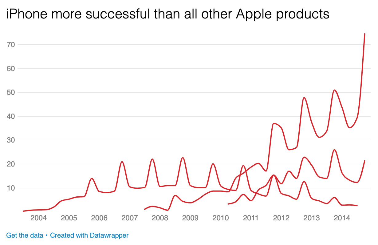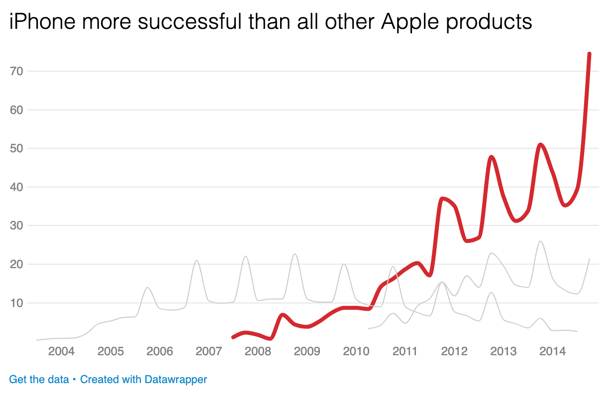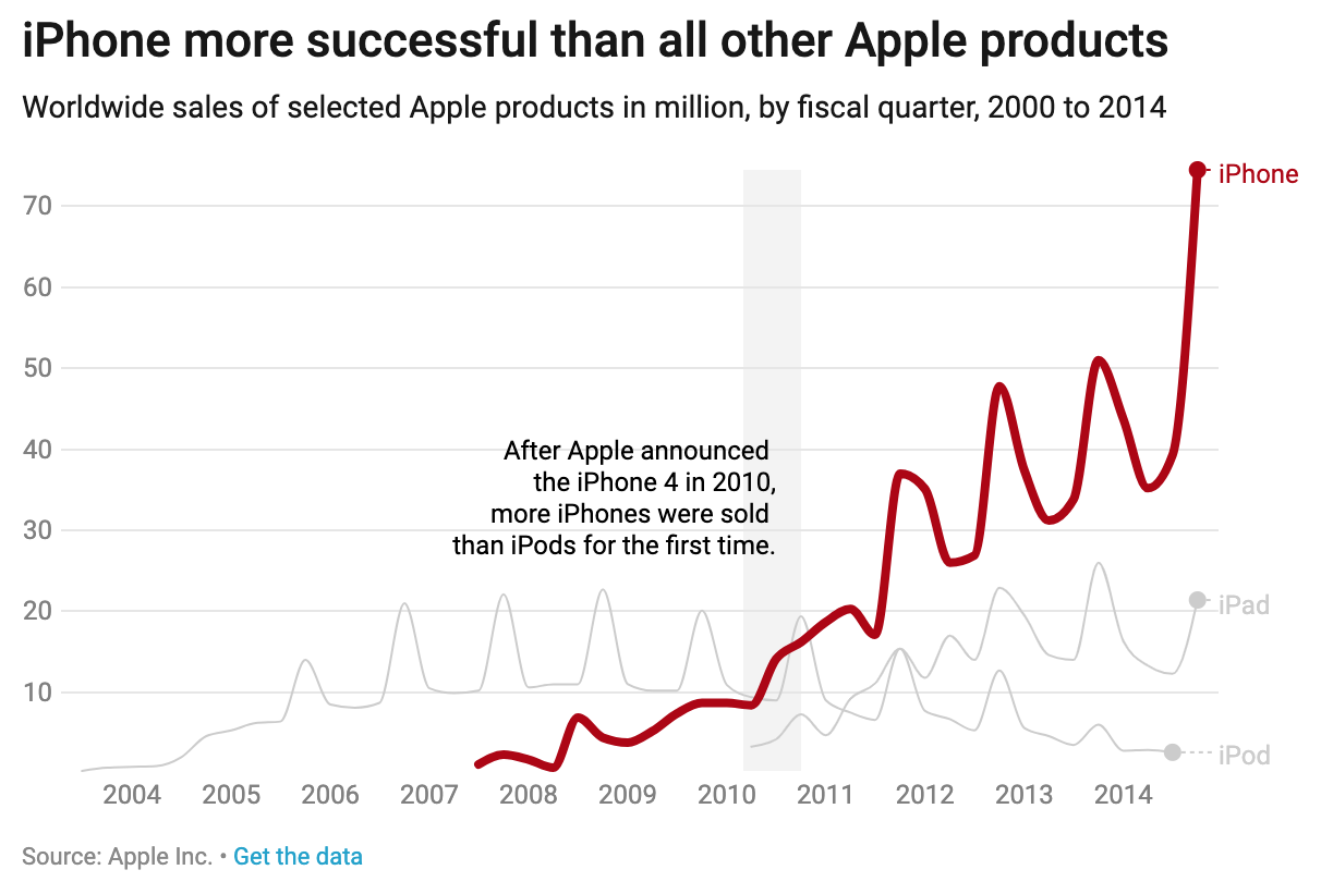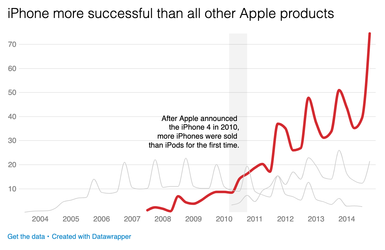 Isto porque o cinza permite que outros elementos – aquilo que realmente importa – apareçam em destaque. No terceiro gráfico, Lisa desenha os outros produtos da Apple em cinza e usa vermelho na linha temporal do iPhone, destacando assim sua performance.