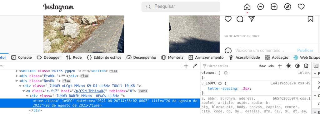 Analisando o código-fonte de uma postagem do Instagram, é possível encontrar o horário exato de postagem da foto, procurando pela palavra “timestamp”. No caso, encontramos o seguinte valor: 2021-08-20T14:36:02.000Z.