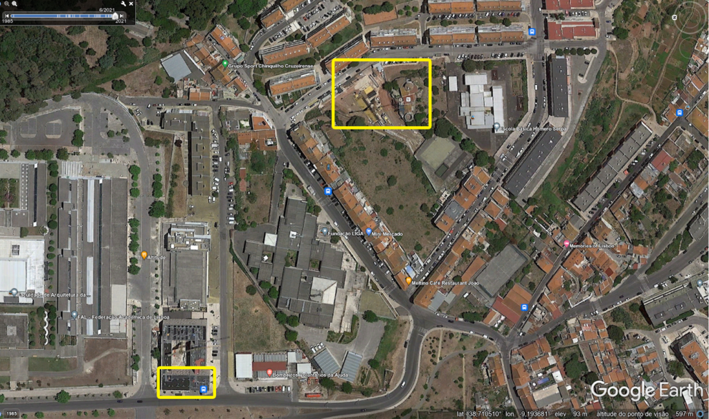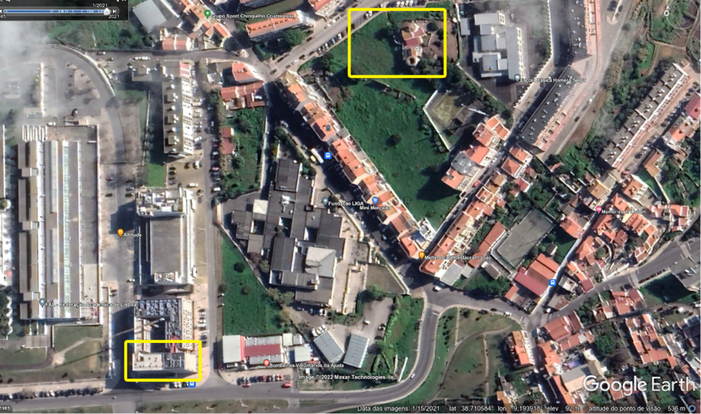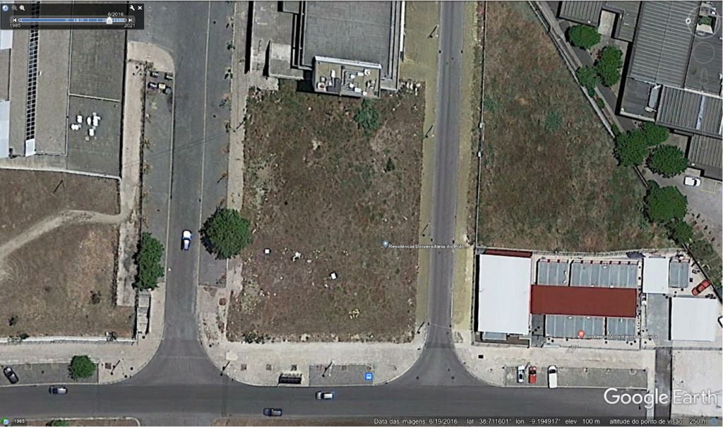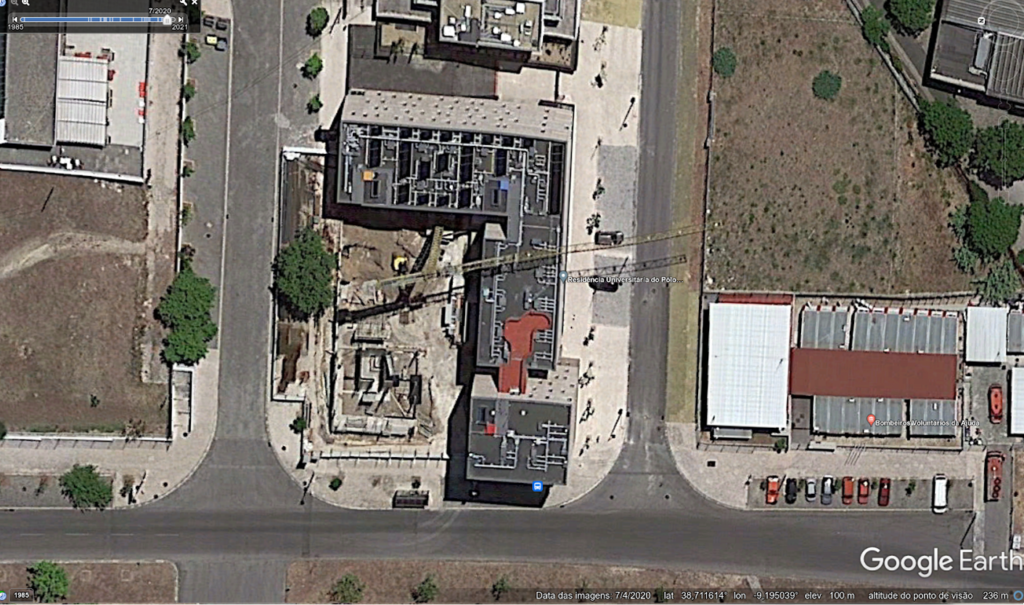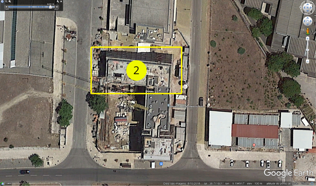 Acompanhando a sequência no Google Earth, em maio e julho de 2019, as imagens mostram, respectivamente, transformações na região 2, que parecem mostrar o avanço das obras, e uma ausência de sinais de construção civil em um segundo momento. Isso vai ao encontro da notícia de julho de 2019, que encontramos na busca reversa e trata da inauguração da ‘Residência Universitária do Campus da Ajuda’. O Google Street View oferece uma visão do local em setembro de 2019.