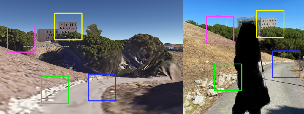 Clique aqui para acessar o Pólo Universitário da Ajuda, visualizado no Google Earth na web. No Google Earth Pro, é possível ter mais flexibilidade de configurar a posição da câmera, acessar recursos do Street View e também inserir a foto original como uma camada sobrepondo o espaço, para fins de verificação. Repare que, analisando as imagens com a ferramenta, é possível identificar até mesmo um poste, que corresponde ao objeto que tem a sombra projetada no caminho que aparece atrás da pessoa. Este é um detalhe que será importante para nossa etapa de cronolocalização, no final do tutorial.