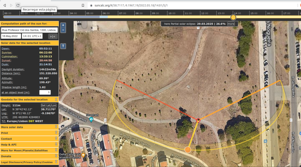 Depois de abrir a plataforma, faça uma busca pelas coordenadas de latitude e longitude do local onde a foto foi tirada (não são as coordenadas do prédio que usamos como ponto de referência) e insira a data de 20 de agosto de 2021 e dê um zoom na localização desejada. Outra opção é acessar este link direto para carregar o site já com estas informações inseridas: https://www.suncalc.org/#/38.7117,-9.1967,19/2021.08.20/12:27/3/1