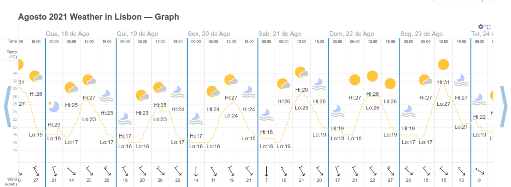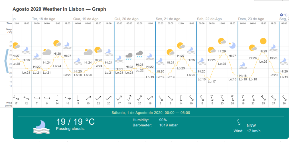 Neste caso, checamos esta informação usando o buscador Wolfram Alpha e o site Time and Date, mas existem vários outros recursos disponíveis. Veja nas imagens abaixo que, de acordo com o site, em 20 de agosto de 2020 Lisboa teve um tempo chuvoso, enquanto que no ano seguinte houve sol e apenas nuvens passageiras.