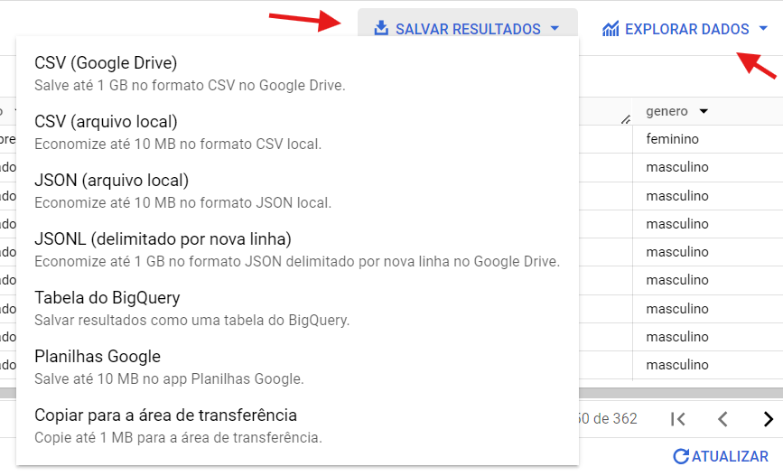O resultado da consulta anterior é retornado no BigQuery em forma de tabela, que você pode exportar em um arquivo local (.csv, JASON ou para a área de transferência do seu computador) para explorar com com seu editor de planilha ou linguagem de programação preferida, ou ainda salvá-los em uma tabela do BigQuery ou Google Sheets, sem precisar fazer download da tabela. Basta clicar em Salvar Resultados ou Extrair Dados. Veja na imagem abaixo.