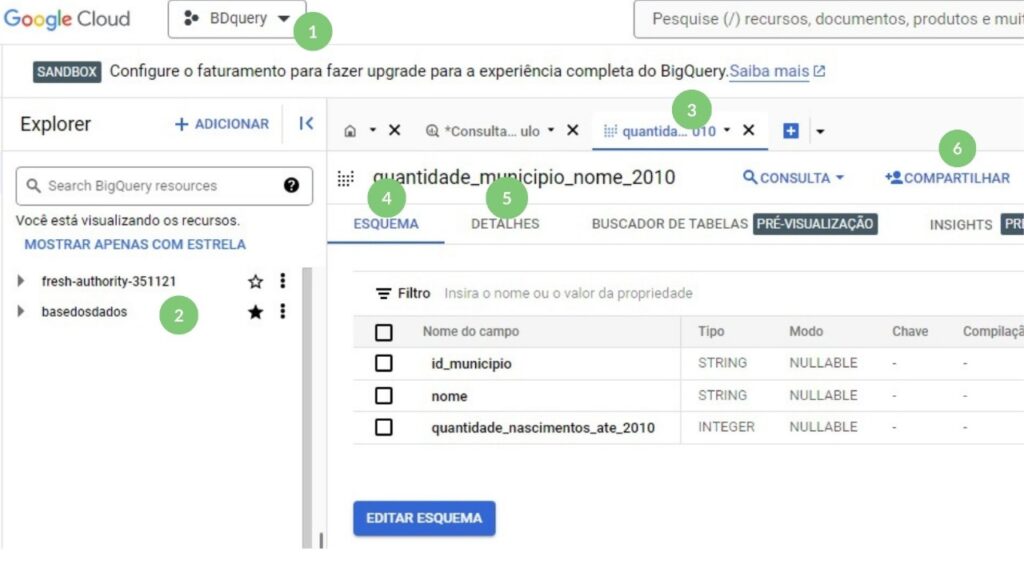 Sempre que abrirmos uma tabela no BigQuery teremos alguns itens que ficarão à mostra: a aba referente à tabela que selecionamos (3) que contém informações sobre a estrutura e descrição das colunas em Esquema (4) e também metadados da tabela em Detalhes (5).