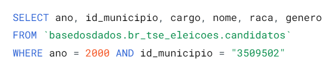 Então, por exemplo, para consultas o nome, cargo, raça e gênero de candidatos(as) de um município e em um ano específico, podemos utilizar a consulta abaixo.