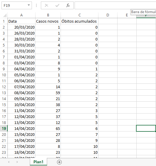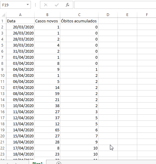 Antes de acessarmos o Flourish, precisamos preparar os nossos dados. O primeiro passo é acessar os dados do Ministério da Saúde e baixar o arquivo .csv completo. O documento que utilizamos como exemplo inclui casos novos e acumulados de contágio e óbitos desde o dia 30 de janeiro de 2020 em todos os estados do Brasil. Neste exemplo, iremos considerar apenas os dados do Amapá até o dia 19 de abril. Por isso, será necessário filtrar os dados do arquivo. Veja a imagem inicial da planilha: