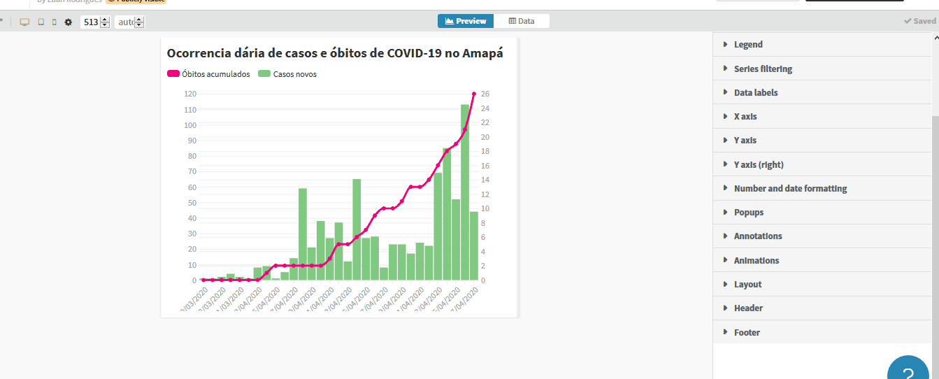 O Flourish é uma plataforma de visualização de dados que permite transformar tabelas em gráficos, mapas e diagramas. Trata-se de uma das principais ferramentas para visualização de dados por meio de interfaces gráficas na web. A iniciativa surgiu em 2016 como uma alternativa à criação de visualizações por meio de linguagens de programação – ou seja, não é necessário saber programar para usar o Flourish. A ferramenta apresenta versões gratuita e paga. Neste tutorial, iremos conhecer um pouco melhor suas funcionalidades e aprender a criar um gráfico simples a partir de dados do Ministério da Saúde sobre a Covid-19. Esta visualização irá indicar a evolução dos casos e dos óbitos no Amapá.