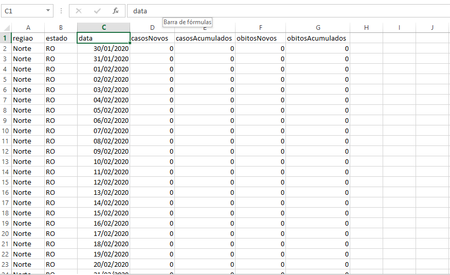 Em seguida, incluiremos os dados de cabeçalho, dando nomes às colunas: data, casos novos e óbitos acumulados, respectivamente. Por fim, iremos remover as linhas em que não existem casos novos para diminuir a quantidade de dados presentes no gráfico.