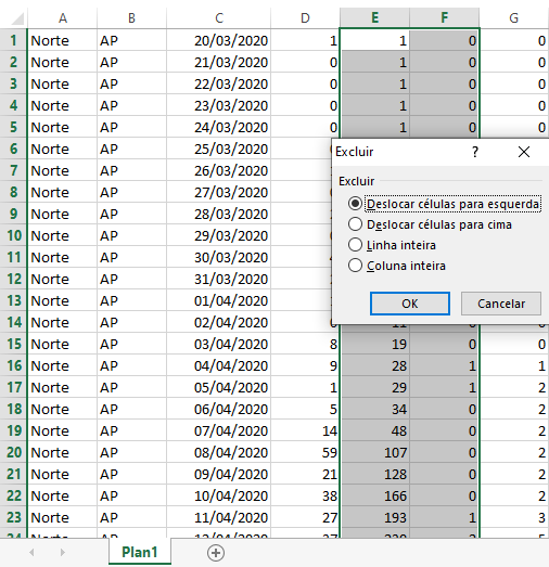 Você deverá selecionar, copiar e colar este trecho em uma nova planilha. Então, será necessário excluir as colunas A, B, E e F, referentes a região, estado, casos acumulados e óbitos novos, sempre recuando as células para esquerda. O gráfico que iremos criar mostrará apenas a data, os casos novos e os óbitos acumulados. Assim: