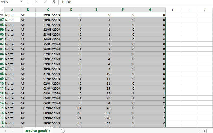 Neste tutorial, serão úteis apenas as linhas que se referem ao Amapá entre o dia 20 de março (data do primeiro registro de Covid-19) no estado e o dia 27 de abril. Assim, precisaremos apenas das informações desse estado: