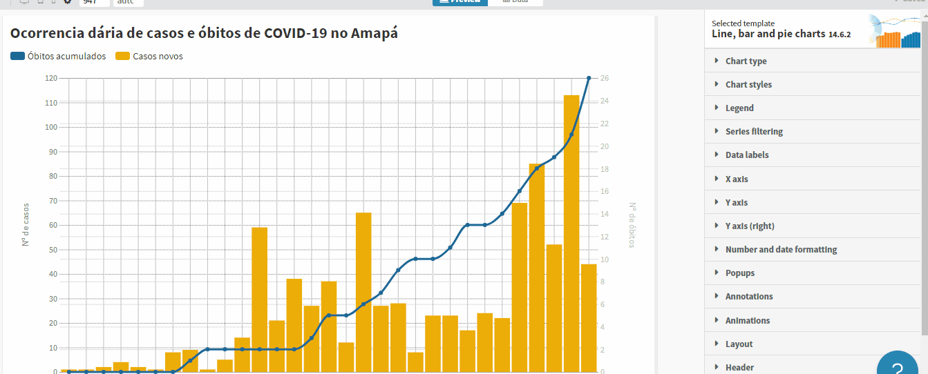 Optamos por este tipo de gráfico porque este modelo mostrará, de forma simplificada, a variação de ocorrências (eixo Y) ao longo do tempo (eixo x). No exemplo que mostraremos a seguir, as barras representam valores não acumulados – independentes entre eles, portanto – conforme a progressão dos dias. A linha, por sua vez, traz a quantidade de óbitos. Os números são cumulativos e demonstram o crescimento gradual dentro do espaço de tempo proposto.