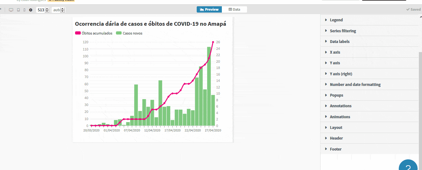 O Flourish é uma plataforma de visualização de dados que permite transformar tabelas em gráficos, mapas e diagramas. Trata-se de uma das principais ferramentas para visualização de dados por meio de interfaces gráficas na web. A iniciativa surgiu em 2016 como uma alternativa à criação de visualizações por meio de linguagens de programação – ou seja, não é necessário saber programar para usar o Flourish. A ferramenta apresenta versões gratuita e paga. Neste tutorial, iremos conhecer um pouco melhor suas funcionalidades e aprender a criar um gráfico simples a partir de dados do Ministério da Saúde sobre a Covid-19. Esta visualização irá indicar a evolução dos casos e dos óbitos no Amapá.