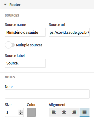 É a opção para configurar o rodapé do gráfico. Em sources, identifique a fonte de origem dos dados (source name) e sua URL (source url). Adicione informações em notes e modifque o estilo em size, color e alignment. Em border, estabeleça uma linha divisória e sua localização (top ou bottom). Assim: