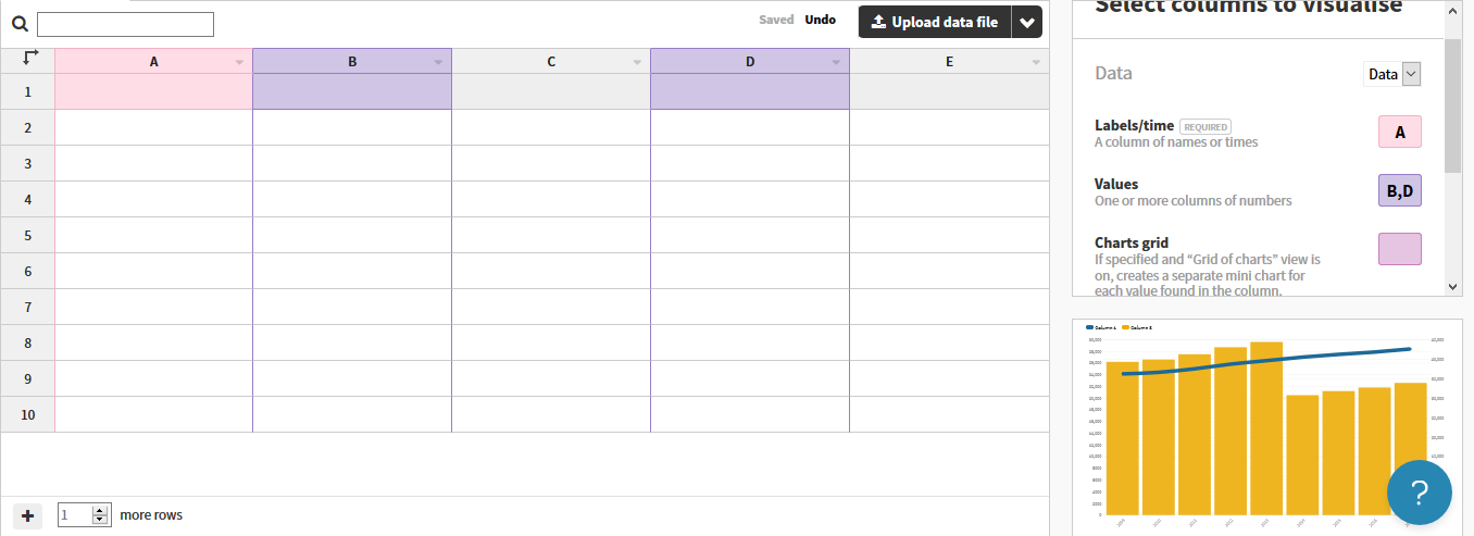 4. Importar os dados – procure a aba data e delete dados existentes, se houver. Neste mesmo ambiente, cole a planilha com as informações sobre Covid-19. Observe que que os valores indicados no gráfico estão apenas nas colunas B e D. Logo, selecione as colunas B e C na opção values, porque o gráfico que será contará com apenas três colunas.