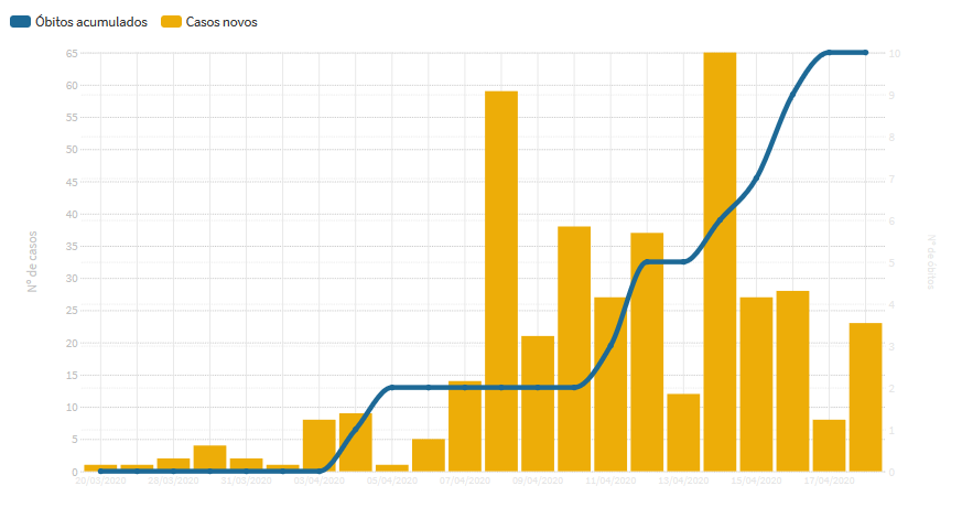O gráfico gerado neste tutorial apresenta óbitos acumulados (linha) por Covid-19 e casos novos por dia (barras) de março a abril de 2020 no estado do Amapá.