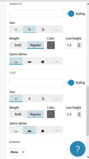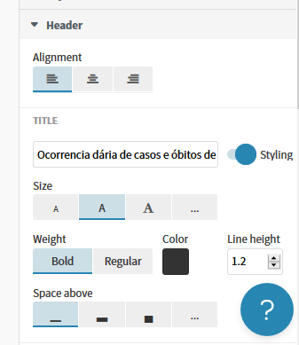 Neste item, é possível configurar o cabeçalho do gráfico. Selecione alignment para alterar a disposição do texto e title para incluir um título e modificar seu tamanho (size), cor (color), formato (bold/regular) e margem (height). Adicione também subtítulo (subtitle) e texto de apoio (text). Em border, opte pelo uso de uma divisória no gráfico e sua localização (top, bottom ou none). Altere ainda a espessura (width), a cor (color) e o modelo de linha (style: solid, dashed ou dotted). Veja:
