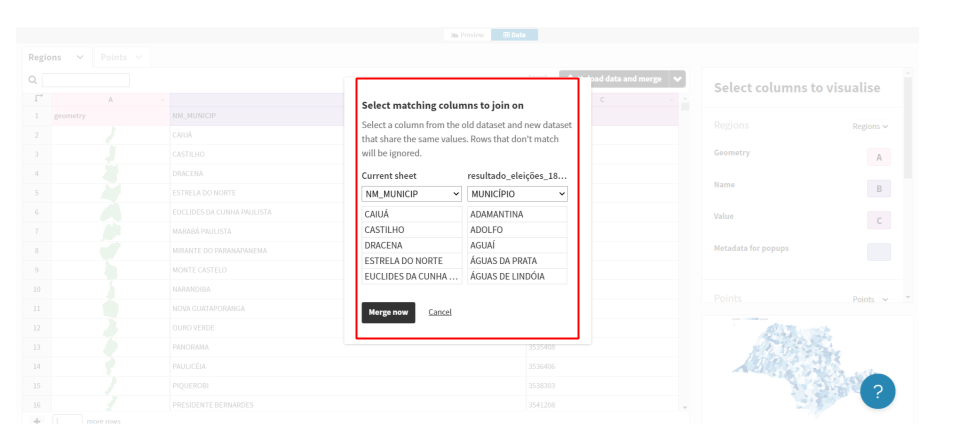 3. Clique em Merge with current sheet, importe e selecione as colunas referentes ao município nos arquivos (nm_municipio e município). Você deverá chegar a uma tela como esta:
