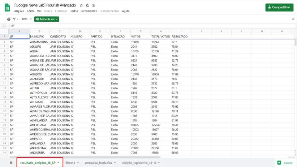 No nosso caso, priorizamos as seguintes informações: nome da cidade, nome do candidato líder de votos naquele município e percentual de votos que tal candidato obteve (veja a coluna resultado em nossa planilha). A versão final ficou assim: