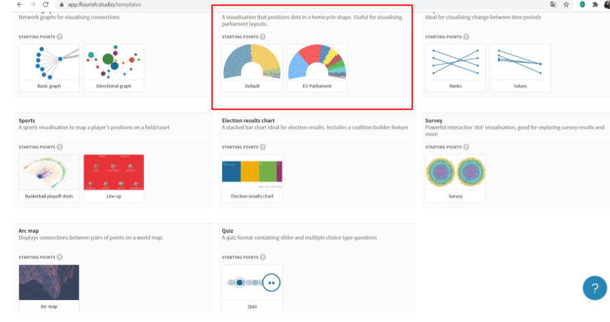1. Crie um projeto de visualização baseado no modelo Parliament chart genérico (default) para assentos de casas legislativas.