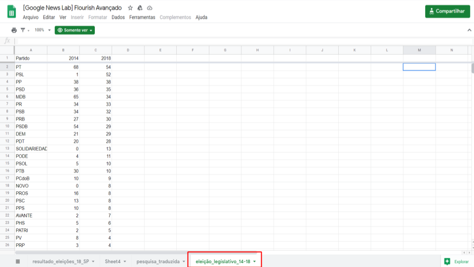 2. Clique em importar dados e escolha o arquivo de download, atentando para a aba eleição_legislativo_14-18. Outra opção é exportar para .csv apenas a planilha escolhida para posteriormente inserir no Flourish. Veja a planilha que será utilizada: