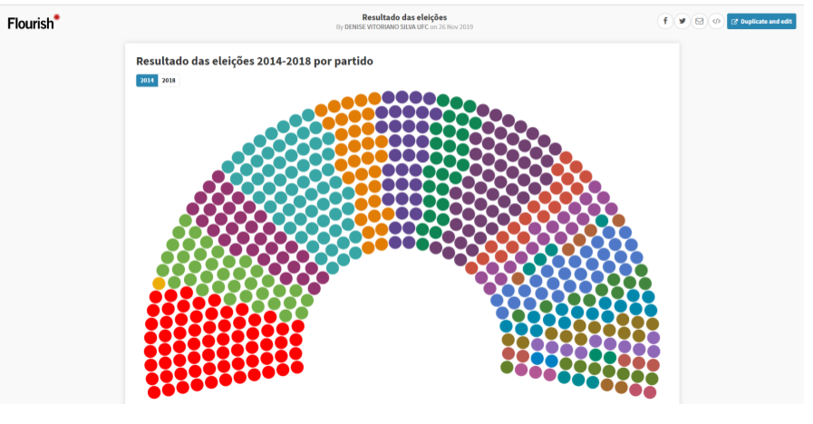 Logo abaixo da visualização propriamente dita, encontra-se a legenda de cores e partidos e uma coluna com a diferença de assentos entre os anos de 2014 e 2018, informação que não aparecia em nossos dados originais e foi incluída por conta da comparação entre períodos.