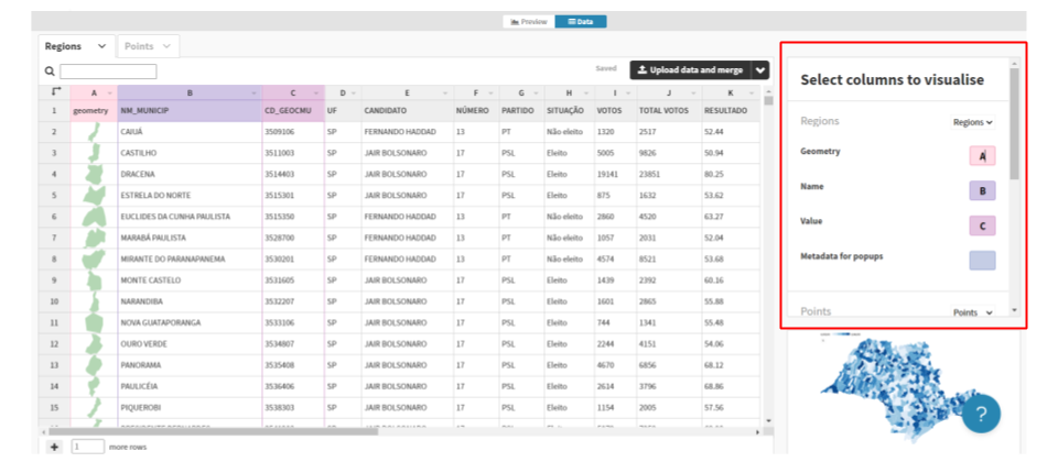 Normalmente, o primeiro passo para uma visualização é preparar os dados que serão utilizados, estruturando-os em uma planilha (.csv) ou copiando e colando na seção apropriada, dentro do Flourish. Neste caso, já temos todas informações necessárias para fazer o mapa eleitoral. Para acesso facilitado a dados eleitorais, caso você queira adaptar este tutorial para outras votações, sugerimos a consulta ao site CEPESPData.