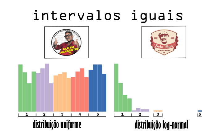Ao gerar dois datasets, o primeiro a partir de uma distribuição uniforme e outro a partir de uma distribuição log-normal, foi realizado uma classificação por intervalos iguais com 5 classes. A figura abaixo, com auxílio dos nossos facilitadores de aprendizagem, ilustra bem os exemplos de casos adequados e inadequados de uso desse tipo de classificador. No histograma da esquerda, temos um padrão de dados bem distribuídos em torno de toda a amplitude, configurando o caso ideal de uso desse tipo de classificador. Ao contrário, no da direita, temos uma distriuição com uma assimetria positiva, concentrando a maior parte dos valores na primeira classe, além do fato de que uma das classes ficou sem nenhum valor associado.