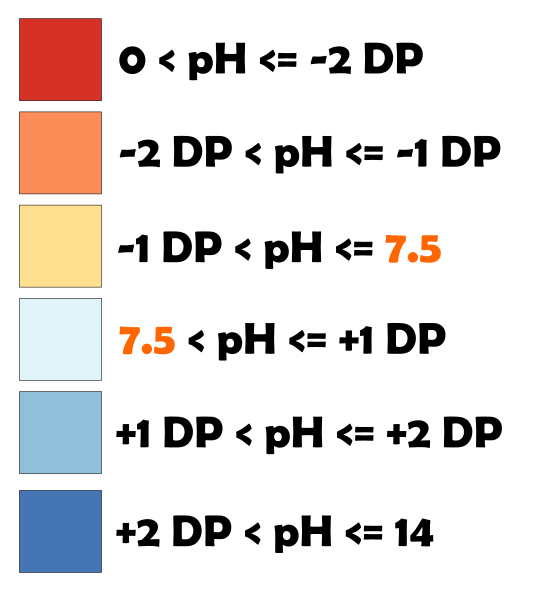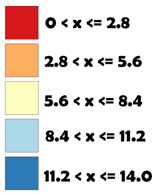 Iniciamos o processo com a determinação do número de classes (N) e com a escolha do método de categorização. A definição de N está associado a pergunta: O quanto de generalização você deseja em seus dados? Quanto maior for N menor será a generalização associada aos dados, todavia, muitas classes poderão implicar em problemas de legibilidade. Dessa forma, o recomendado é algo em torno de 3 a 7 classes. De sorte que, como regra de ouro, um bom início é avaliar o uso de 5 classes. Quanto ao método iremos utilizar o de intervalo iguais. Assim, calculamos a amplitude (A), para pH temos uma escala adimensional entre 0 e 14, portanto, A = 14. Para calcular o intervalo intra classe: A/N=2.8. Assim, concluímos a definição da distribuição dos dados em diferentes intervalos.