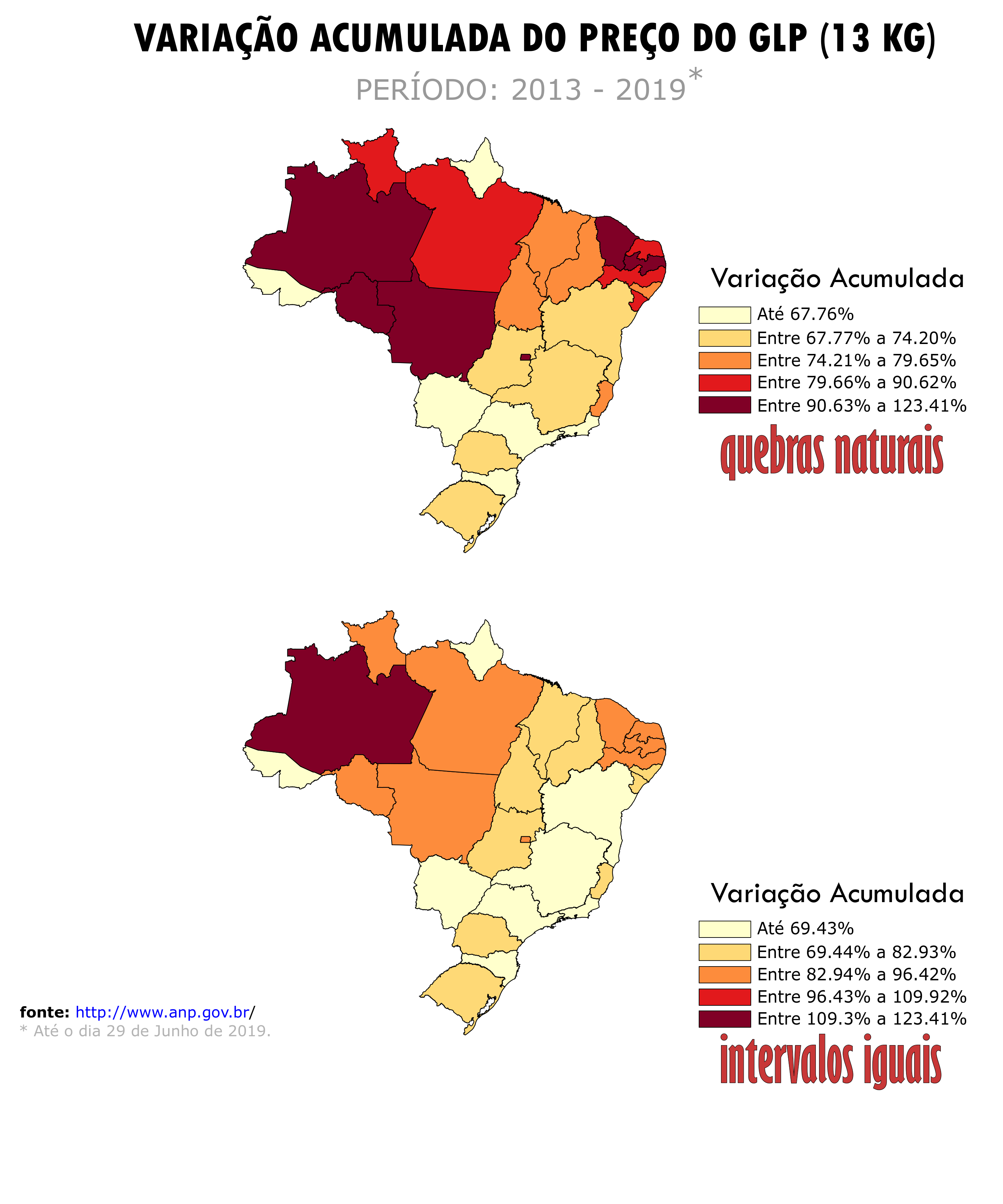 Os histogramas acima apresentam as diferenças entre os métodos comparados. Todavia, o impacto dessa classificação para dados apresentados em um mapa é ainda mais relevante. Considere o Levantamento de Preços e de Margens de Comercialização de Combustíveis realizado pela Agência Nacional do Petróleo, Gás Natural e Biocombustíveis (ANP). Os mapas abaixo apresentam a variação acumulada do preço do gás de cozinha (GLP) – em base nominal – entre janeiro de 2013 a junho de 2019. Logo, quando os dados são classificados pelo método de quebras naturais temos um maior número de estados associados as duas últimas categorias. Assim, evidencia-se que estados do Norte e Nordeste tiveram aumentos percentuais maiores que as demais regiões do país.