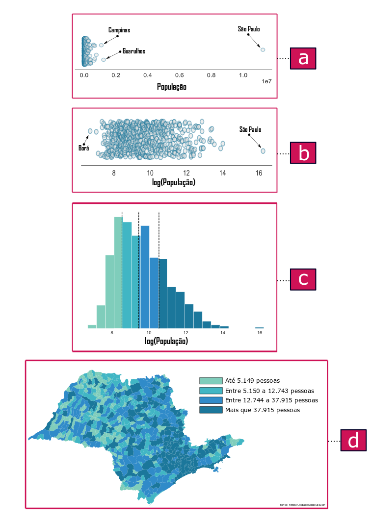 Uma abordagem para analisar dados que possuem outliers extremos como os apresentados no gráfico [a] é fazer uma transformação para uma outra escala, por exemplo, a logarítmica. O gráfico [b] apresenta o resultado dessa transformação. Desse modo, a distribuição dos dados fica mais evidente, tornando possível identificar o município de Borá que possui o menor número de habitantes registrado naquele censo, com apenas 805 habitantes. Diante disso, foi possível aplicar um método de classificação, como o por quantis, como bem ilustra o histograma do gráfico [c]. Por fim, foi possível construir o mapa coroplético [d] com os municípios associados a intervalos populacionais mais adequados.